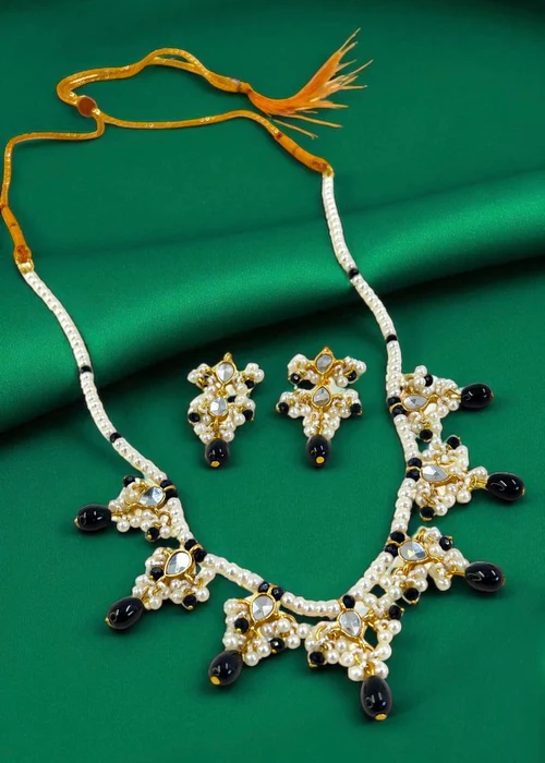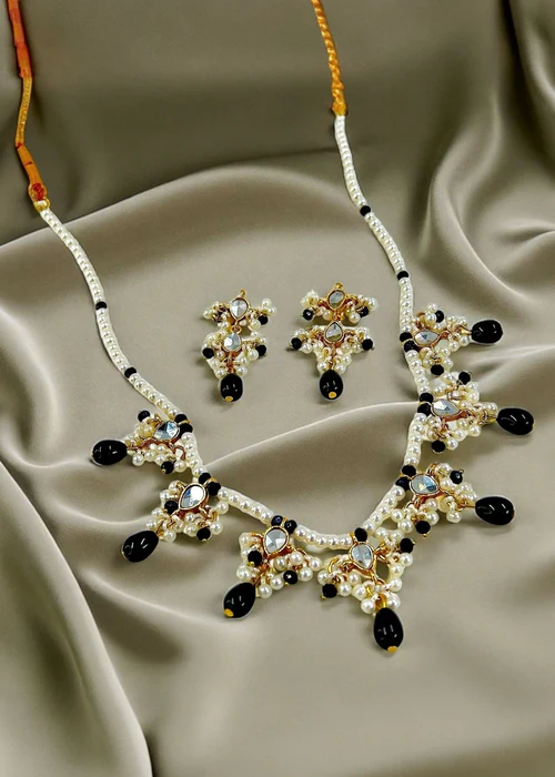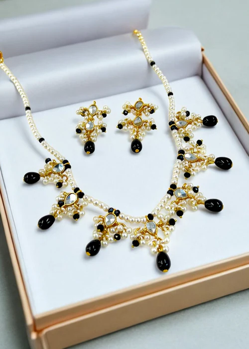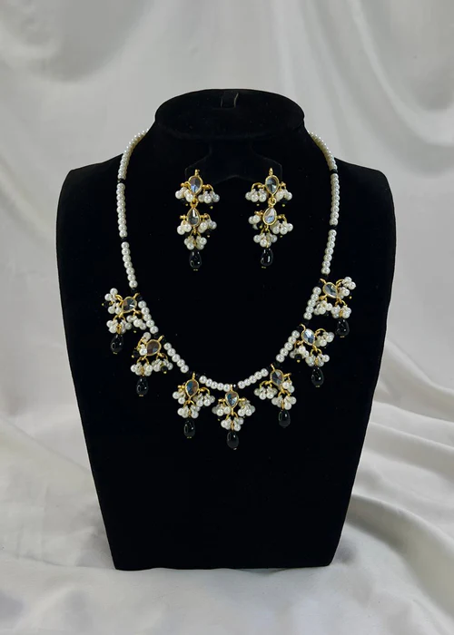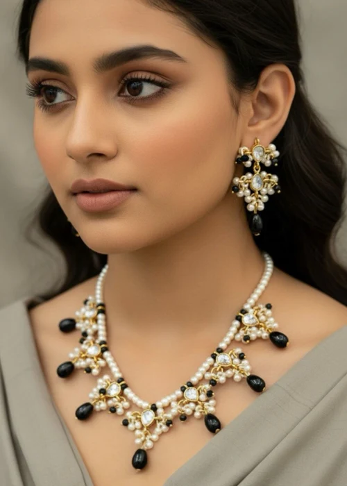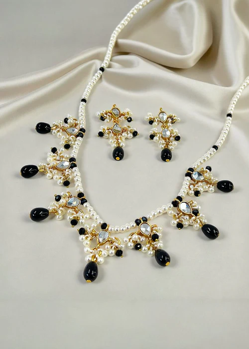 Elevate your style with this sophisticated — a perfect mix of glamor and elegance. The set includes a graceful necklace and a pair of matching drop earrings, both adorned with lustrous black synthetic pearls that exude charm and sophistication.