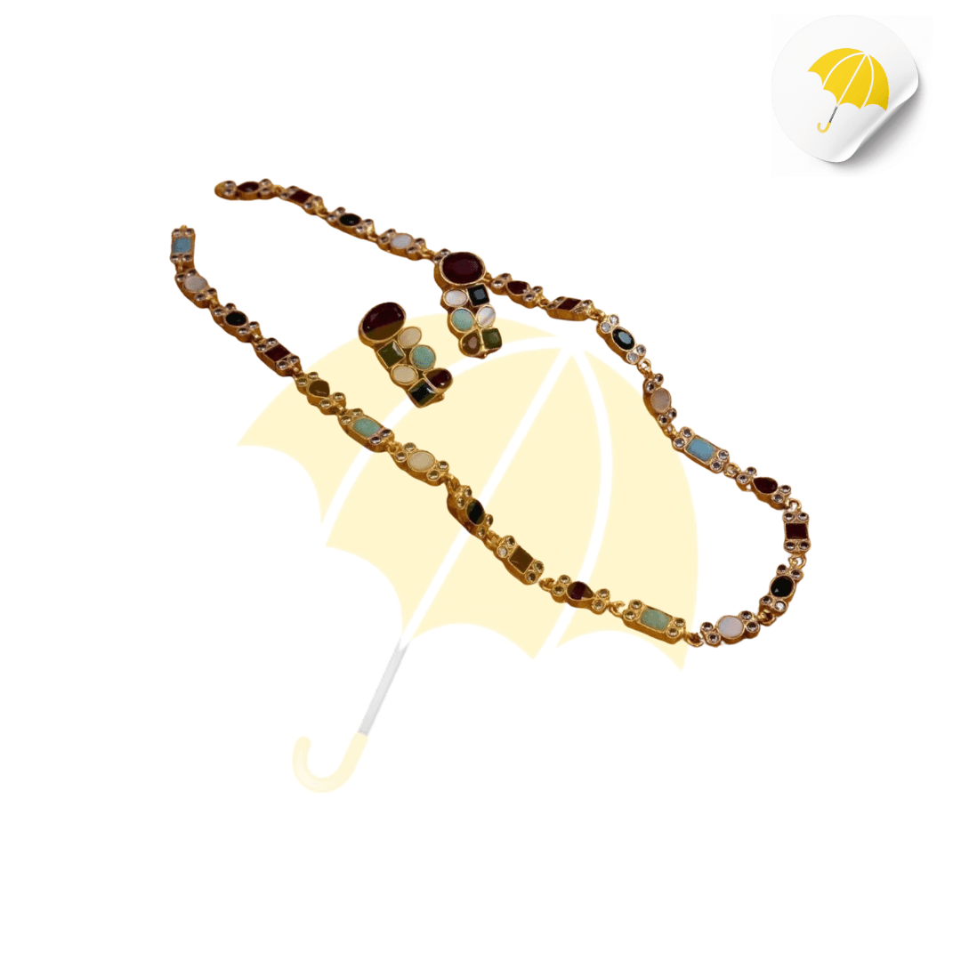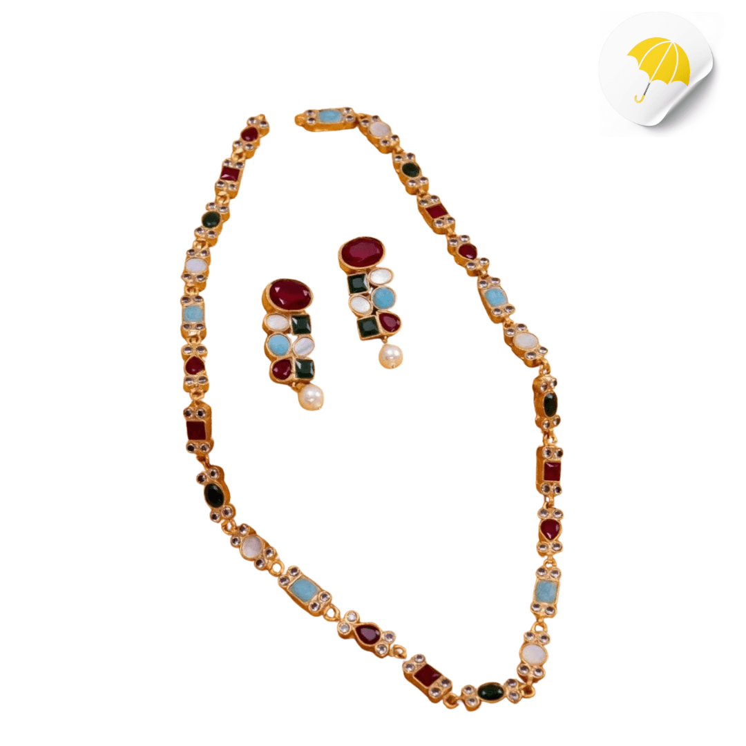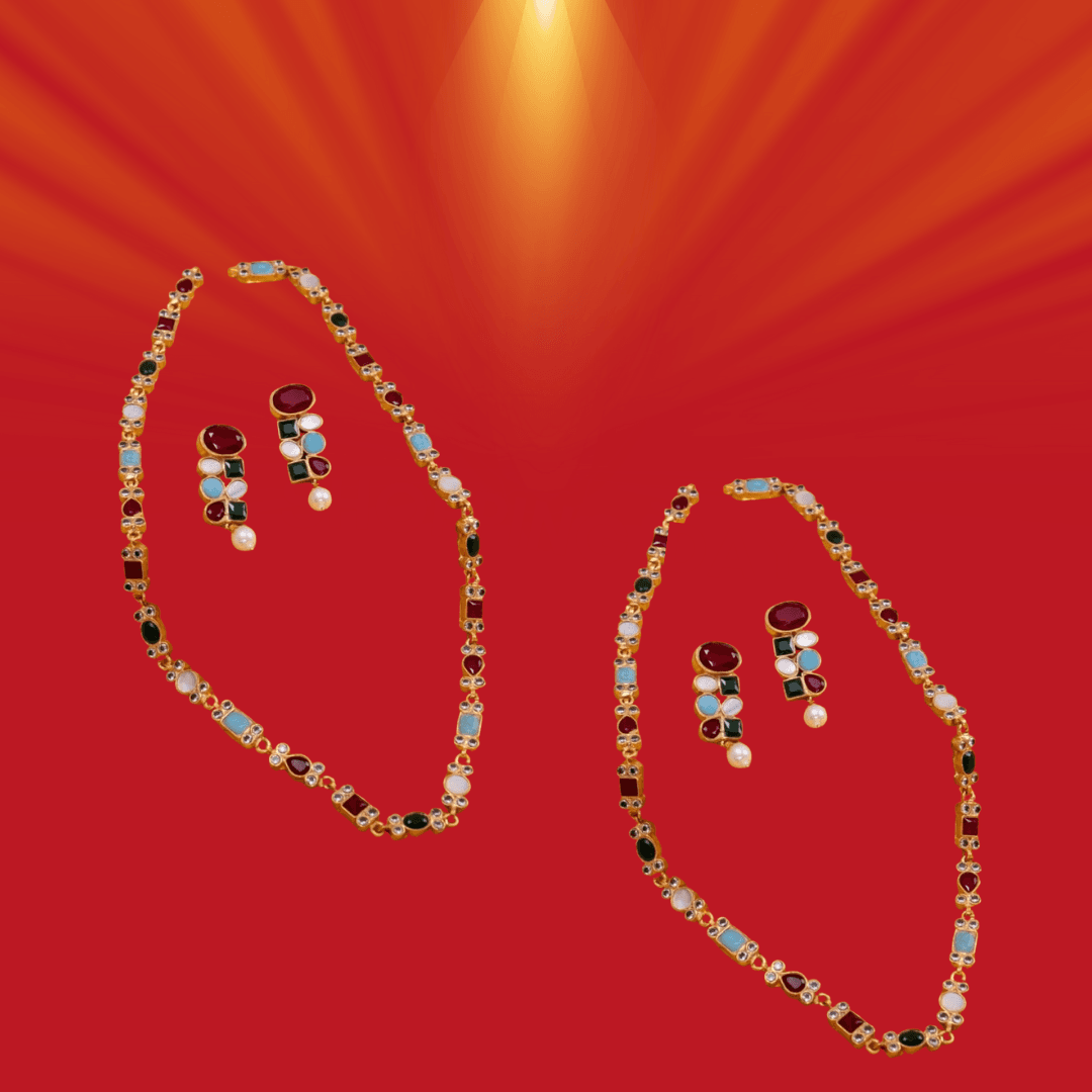 Introducing the Multi Mala Set – a refined jewellery set crafted for women who appreciate style and versatility. The main piece is a 24-inch long necklace (mala) made from copper base metal, finished with a gold-plated coating for a rich, radiant look. The design features synthetic/ imitation stones that deliver shine and sparkle without the high cost of precious gems.
