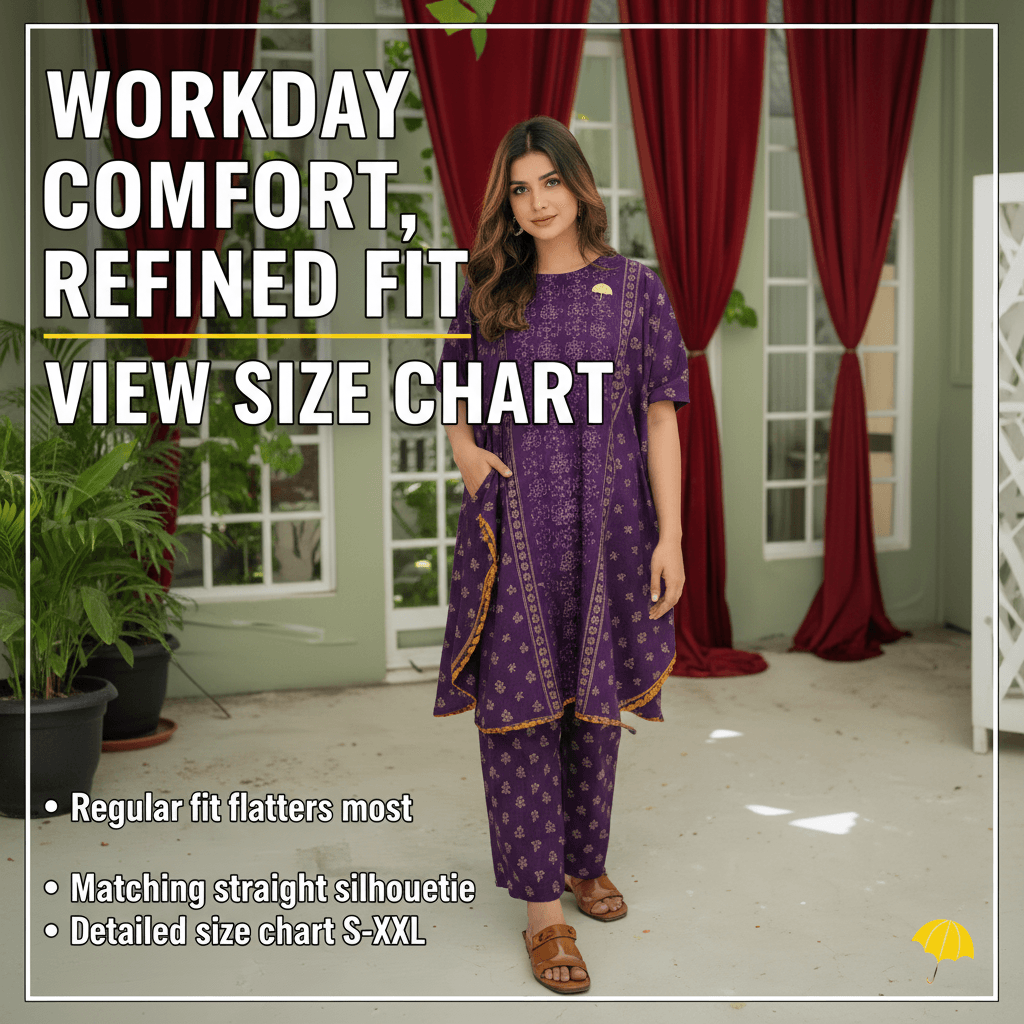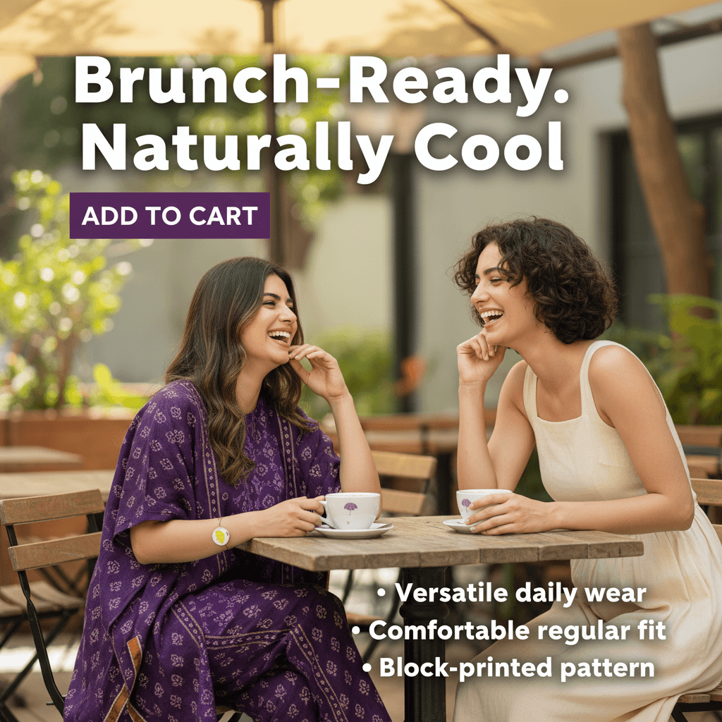 The top features a classic block-printed pattern that adds a touch of visual interest while keeping the outfit versatile for daily wear. This subtle design element makes the set suitable for both informal meetups and casual outings.
